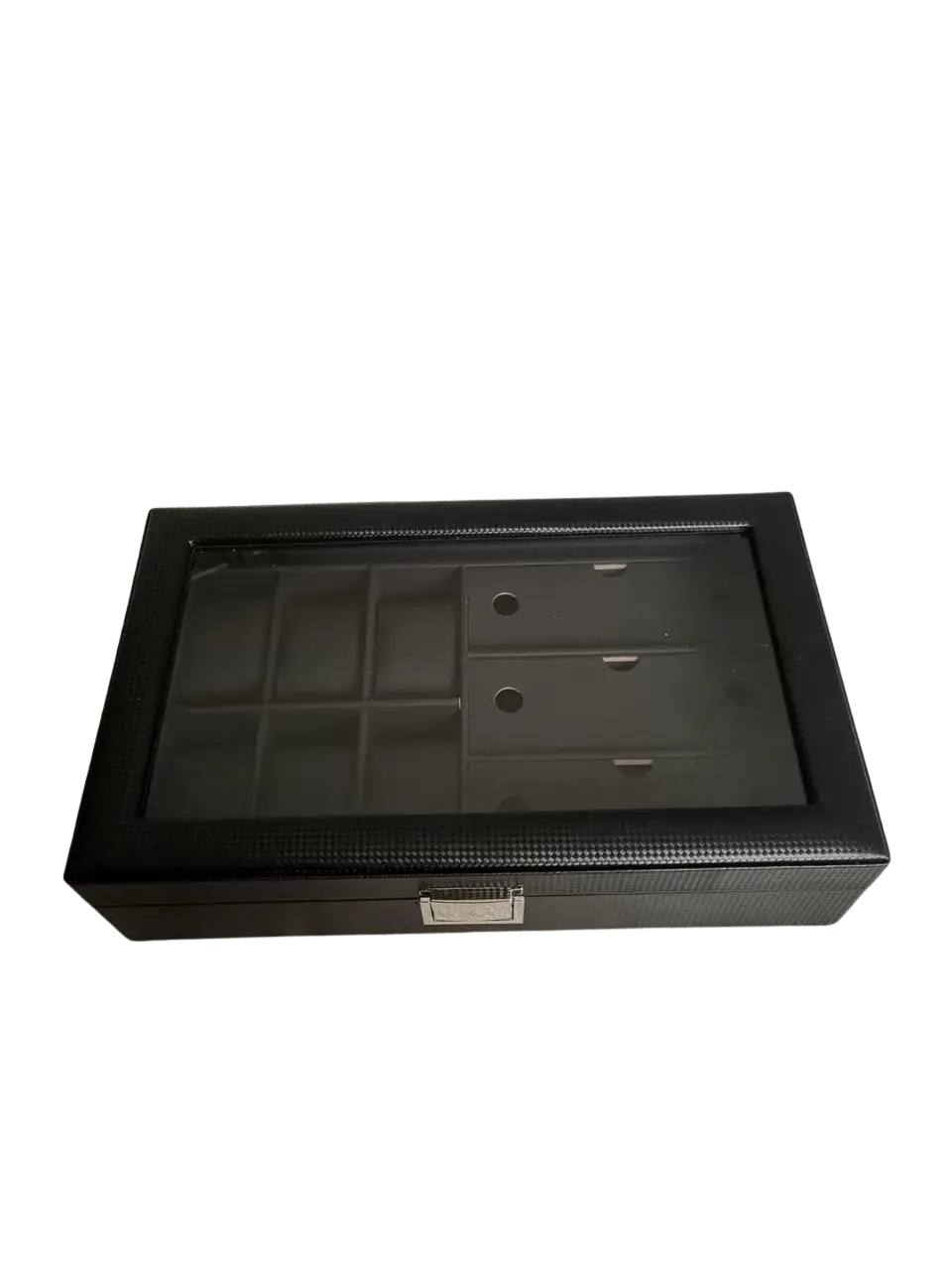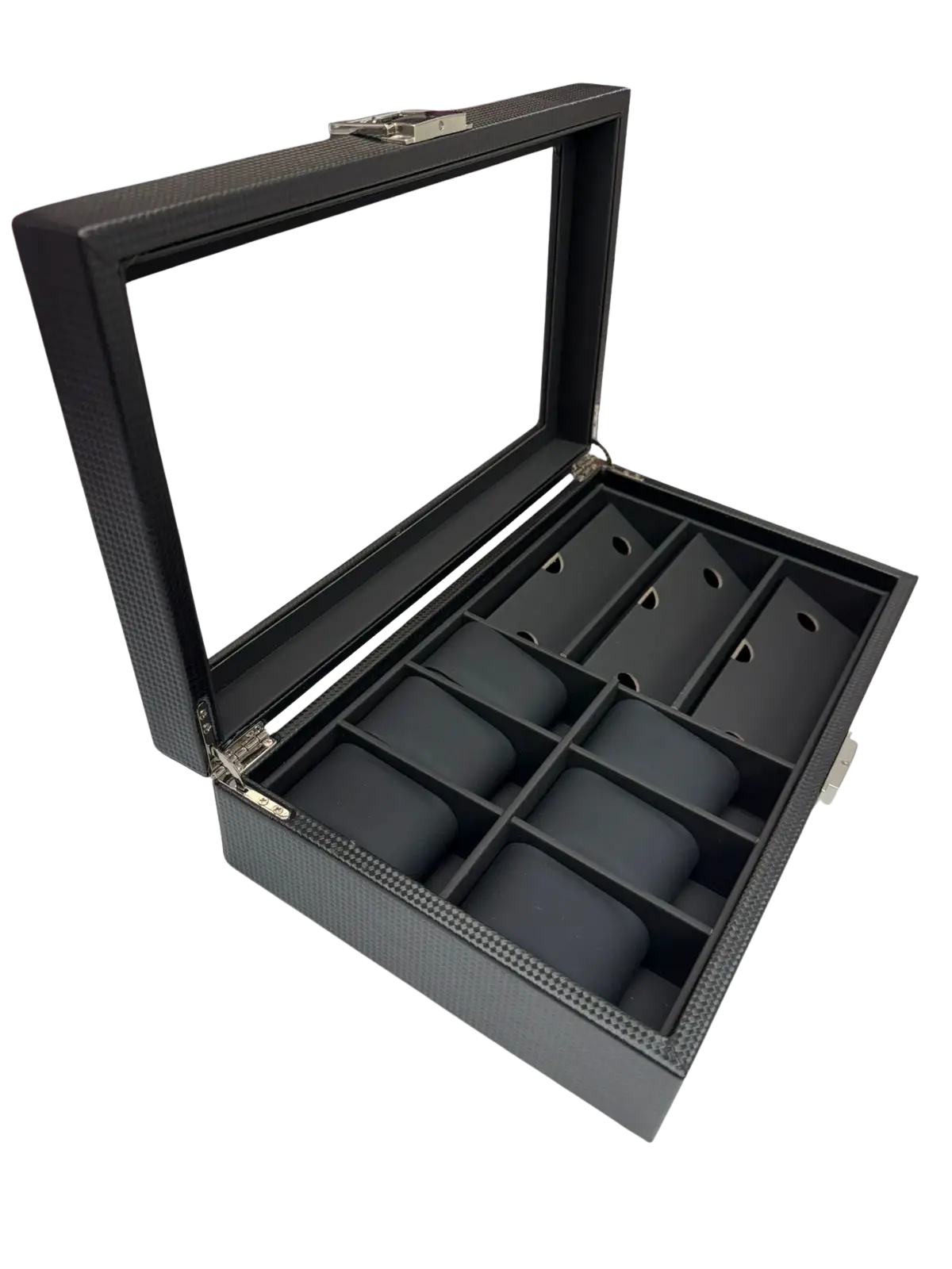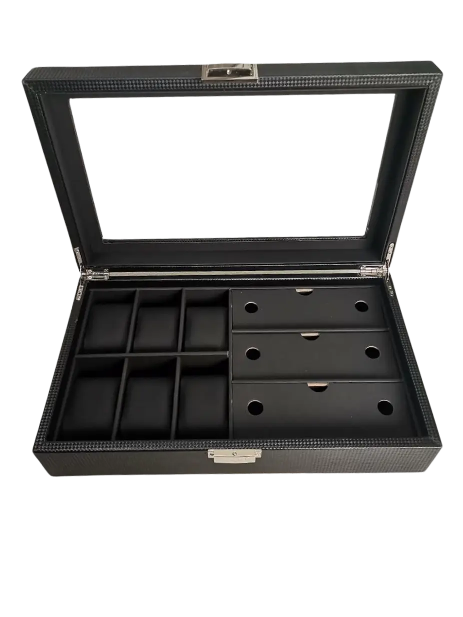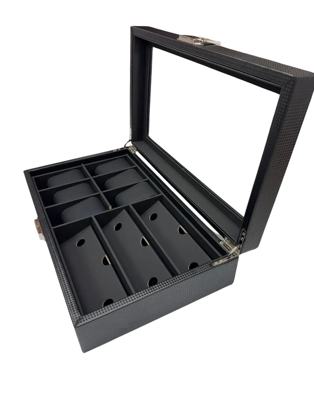 Caja Organizadora para Guardar Relojes y Lentes, 6/3 espacios, Acabado Tipo Fibra de Carbono