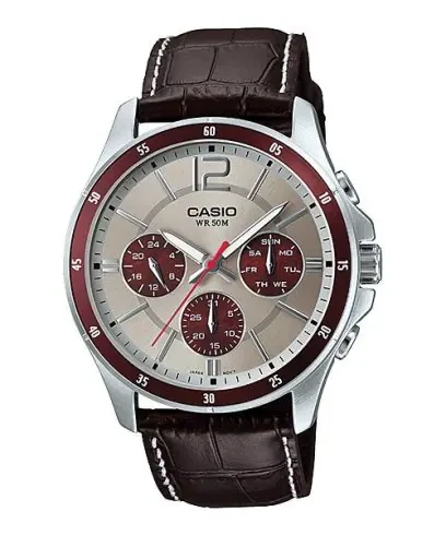 Reloj Casio de caballero con resistencia al agua de 50 metros, indicador de día y fecha y correa de cuero genuino.