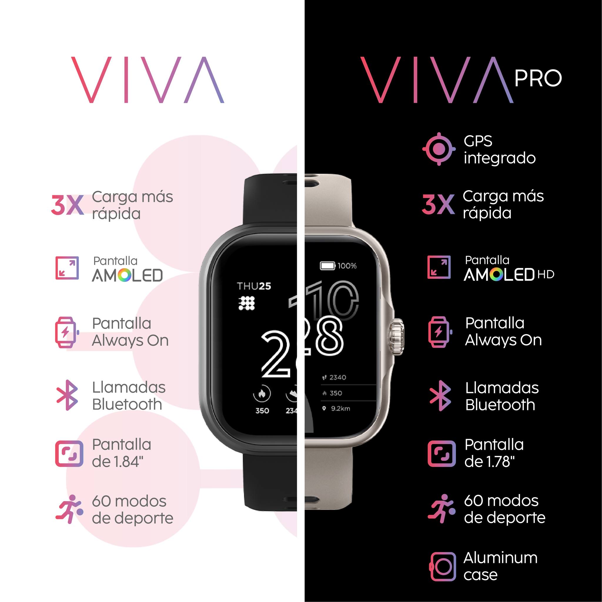 Una mezcla de estilo y tecnología, diseñada para integrarse perfectamente con tu estilo de vida activo y a la moda. Resistente al agua, sensor de ritmo cardíaco, acelerómetro, pantalla de 1.84″ AMOLED, tiempo de funcionamiento de hasta 7 días, batería de 300 mAh, carga USB integrada y Bluetooth BLE5.3