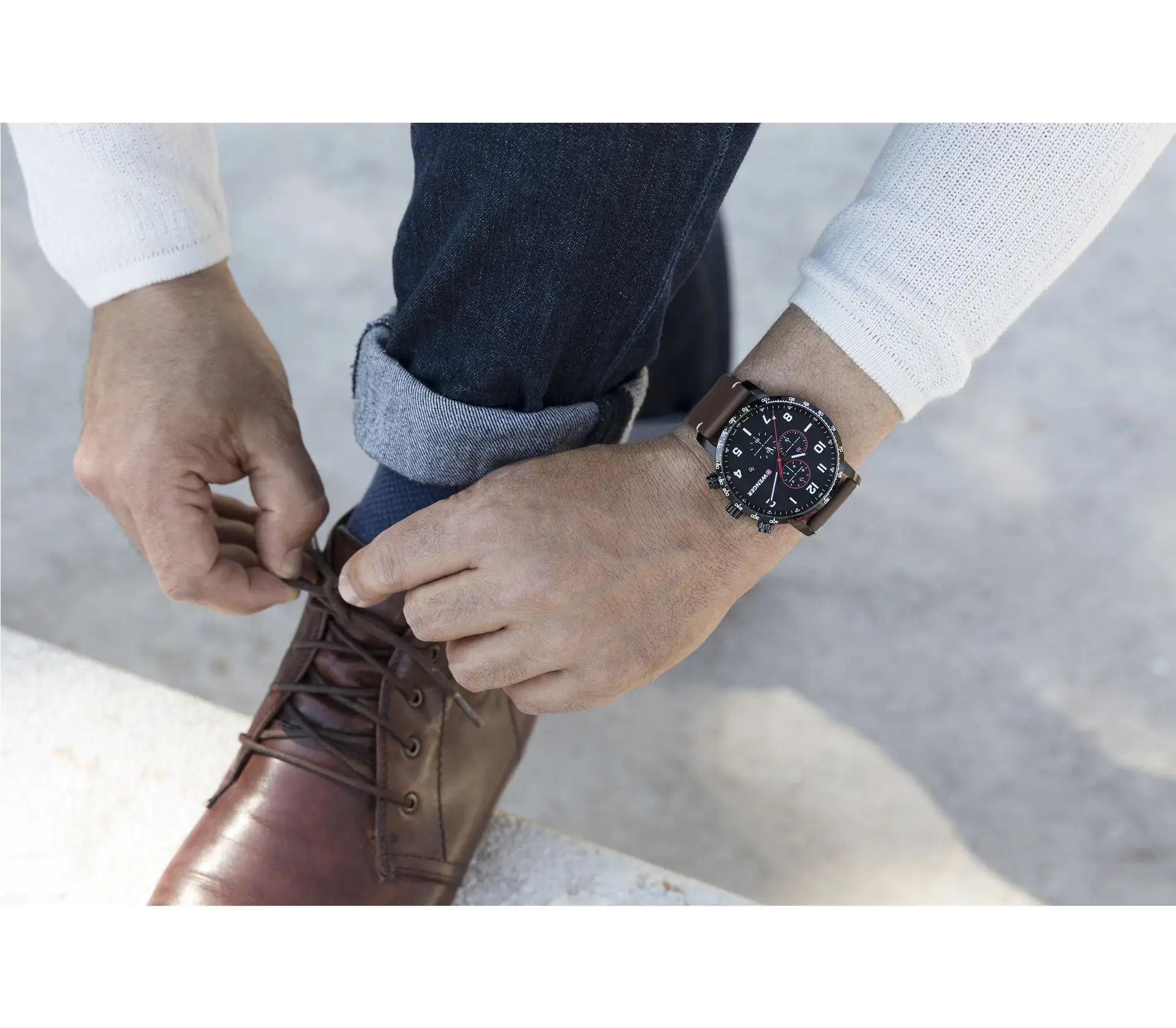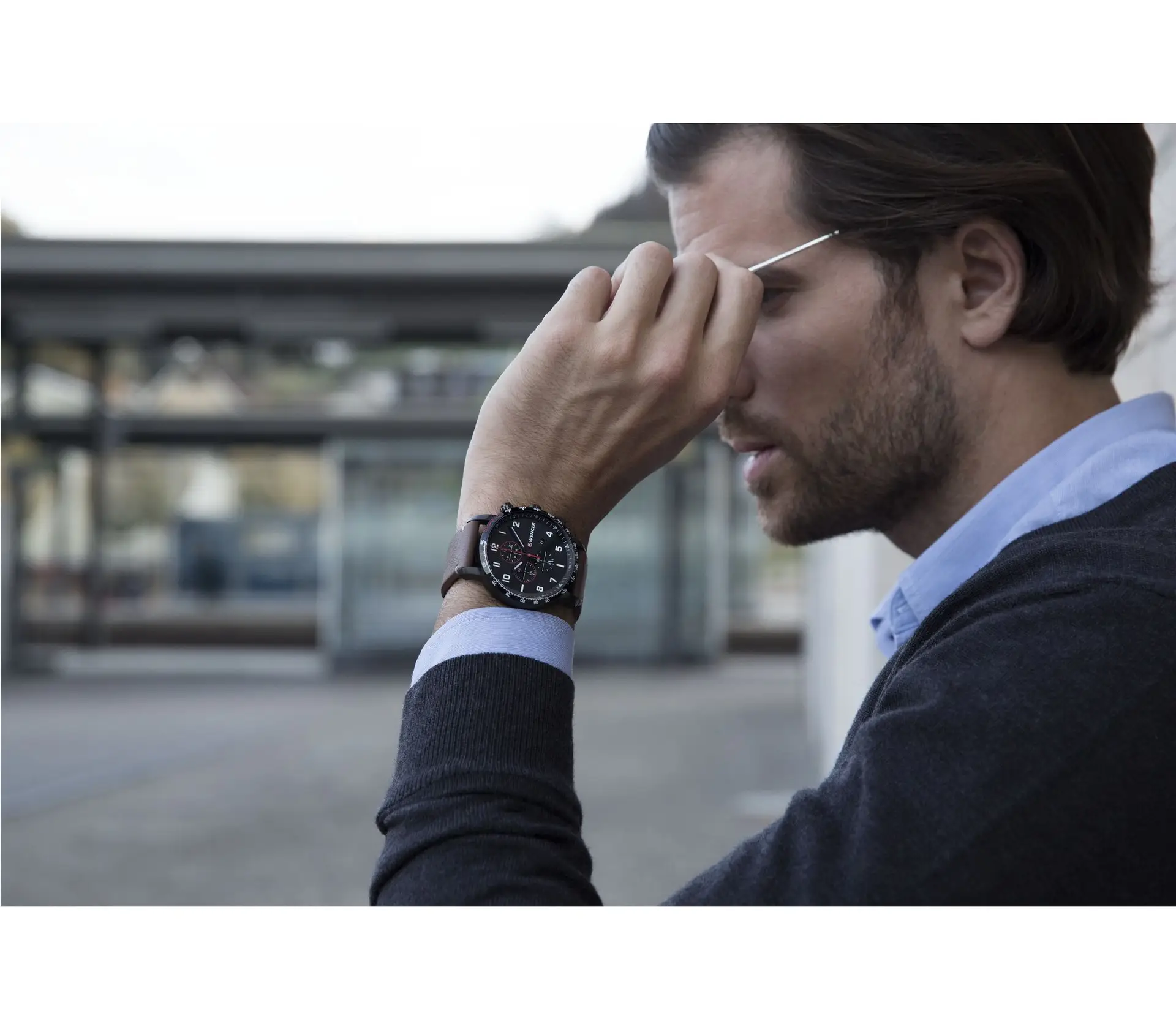 Reloj Chrono con resalte de color. El dinamismo innato de la línea Attitude no es ningún secreto, combina una vitalidad exuberante con un diseño actual. Las líneas esenciales definen su forma; los numerales y las manecillas que brillan en la oscuridad, junto con el toque suizo típico de rojo en el logotipo y en la segunda manecilla, hacen que este reloj sea el accesorio deportivo que complementa cada código de vestimenta.
