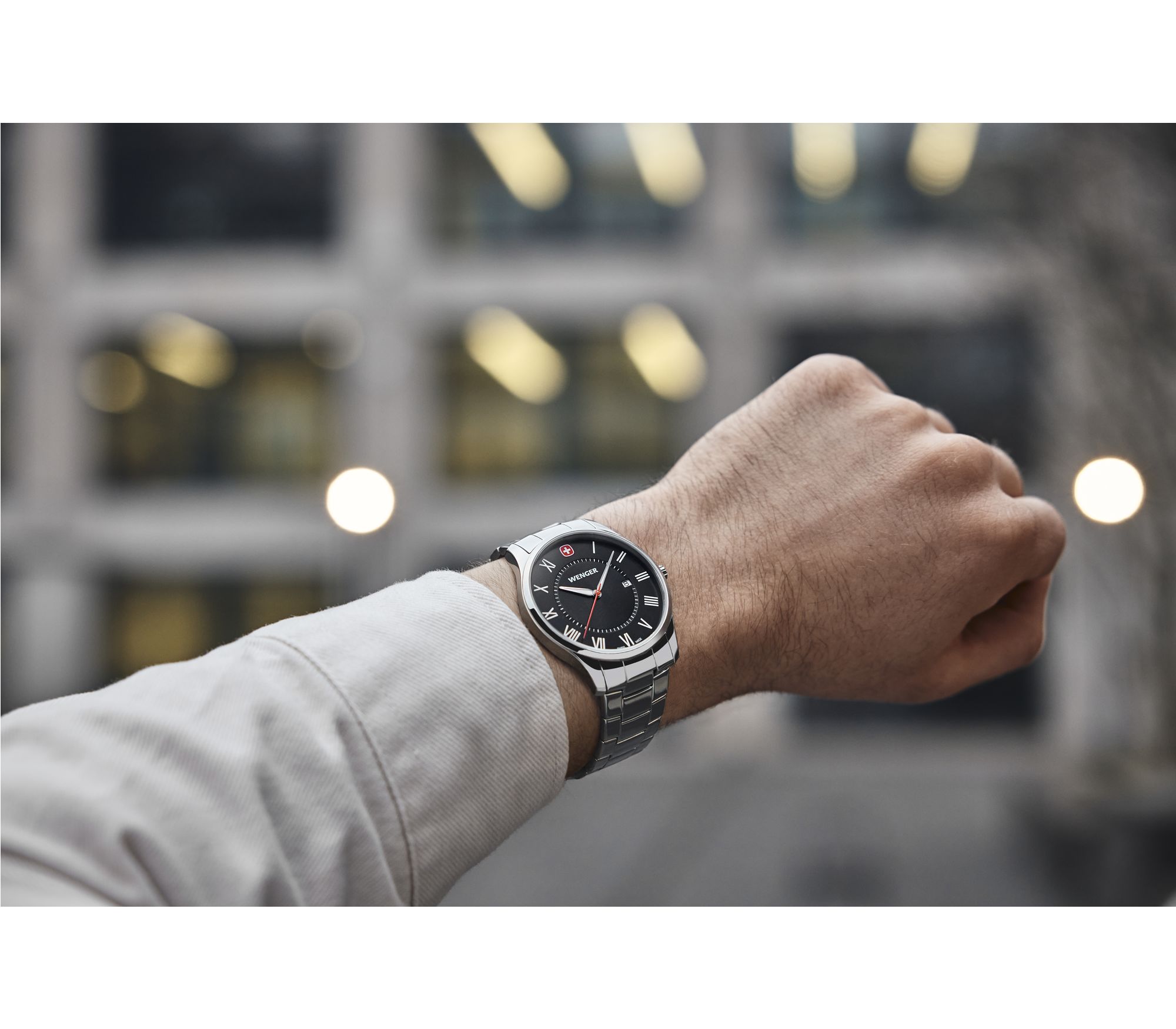 Un reloj delgado, minimalista y clásico. Con nuevas características de precisión y elegancia, el City Classic transmite estilo atemporal y confianza, tanto en una sala de juntas como en una cena elegante. La delgada y pulida caja de acero inoxidable del reloj cuenta con una esfera clásica y refinada, agujas romanas y un indicador de fecha en el lado derecho. A su vez, el minutero con escala de tiempo con corte diamantado le brinda un aspecto elegante. Gracias a las manecillas recubiertas con Super-LumiNova®, que garantizan una buena legibilidad incluso por la noche, este reloj 24/7 fabricado en Suiza se mantiene constante cuando la vida marcha a toda velocidad.